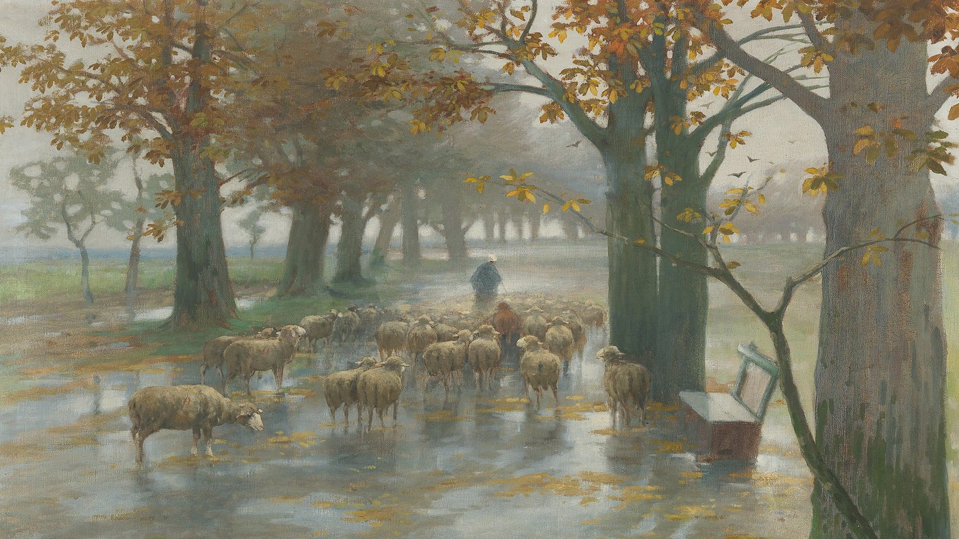 Adolf Kaufmann painted this work with a gentle realism that was popular in the late 19th and early 20th centuries. The muted palette of grays, browns, and soft golds perfectly conveys the atmosphere of a rainy day, where everything feels hushed and subdued. There's an honesty to this painting that makes it easy to imagine the cold dampness in the air, the sound of hooves and sheep bleating, and the shepherdess's patient determination to get her charges where they need to go, rain or shine.