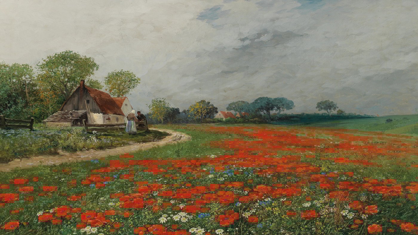 This cheerful landscape captures a brilliant poppy field in full bloom, with splashes of red flowers spreading across green meadows like a natural carpet. A humble cottage with a rust-colored roof sits quietly on the left, where two figures appear to be going about their daily routine. The winding dirt path and scattered white daisies add charm to this peaceful rural scene, while distant trees fade into the misty horizon under an overcast sky.