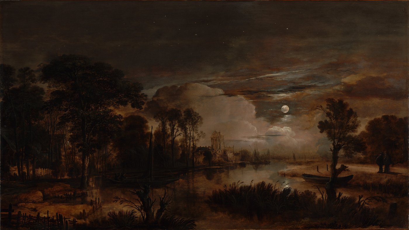 The context of the work lies in its celebration of the Dutch landscape and the subtle beauty of night, making the vast, cloud-filled sky and the shimmering water the true subjects. The small figures and the distant town lights emphasize the stillness and the poetic harmony between man and nature.