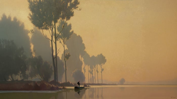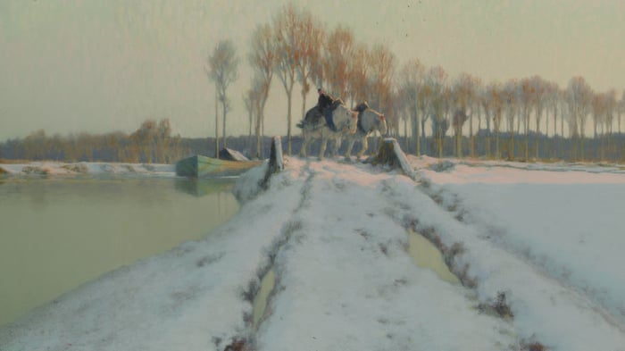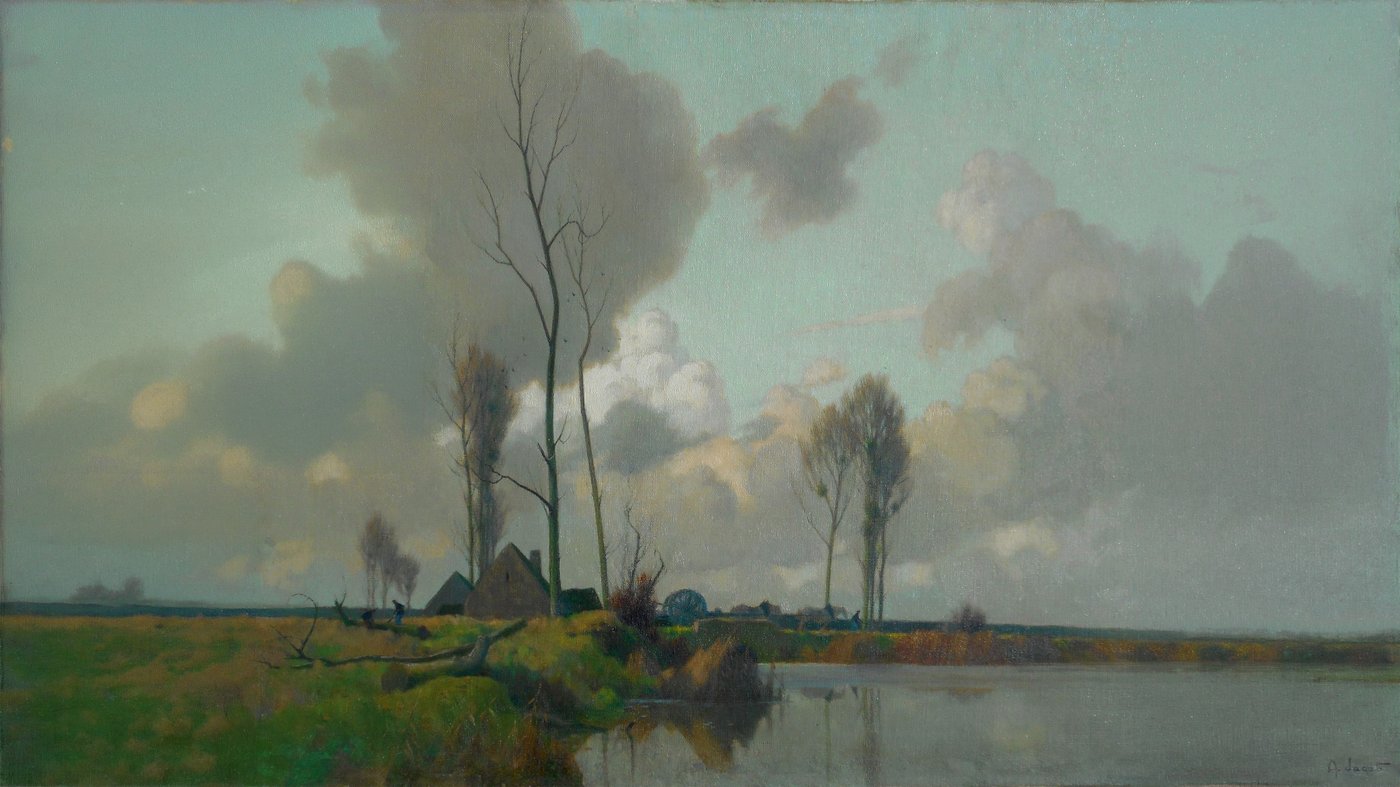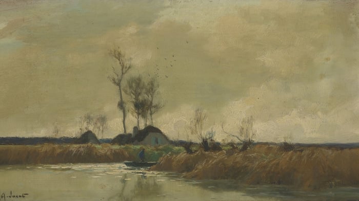 This quiet Dutch-inspired landscape captures the subtle beauty of the French countryside near Amiens, where vast skies meet flat, waterlogged terrain. Alexandre Louis Jacob, a 19th-century French painter, shows us a scene where nature dominates human presence. The tall, bare trees stand like sentinels over modest farm buildings, while thick clouds roll overhead, suggesting the ever-changing weather of northern France. A calm waterway reflects the moody sky, creating a sense of stillness and solitude.