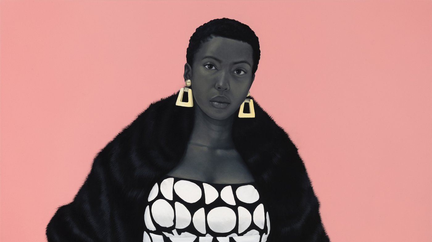 The woman in this painting meets our gaze directly, wearing bold geometric patterns and a luxurious black fur coat, topped off with elegant statement earrings. Set against a soft pink background, she exudes quiet confidence and dignity. Sherald often features everyday people in her work rather than celebrities, elevating ordinary Americans to the grand tradition of formal portraiture. The title references a personal family memory, though Sherald deliberately keeps her titles somewhat mysterious, allowing viewers to bring their own interpretations to the work. Her paintings celebrate Black life and culture while asserting that her subjects deserve the same monumental treatment historically reserved for wealthy white patrons.