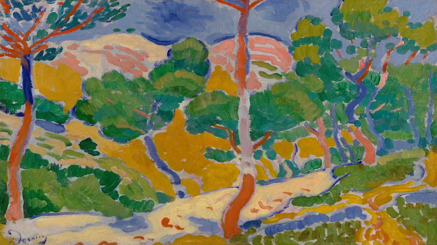 Sunlit hills and trees burst with vibrant color, creating a landscape that feels joyful and alive. Derain uses bold outlines and simplified shapes, letting reds, yellows, greens, and blues collide in a way that turns the scene into a celebration of pure sensation. The trees appear to sway, the sky pulses with warmth, and every brushstroke feels intentional yet spontaneous.