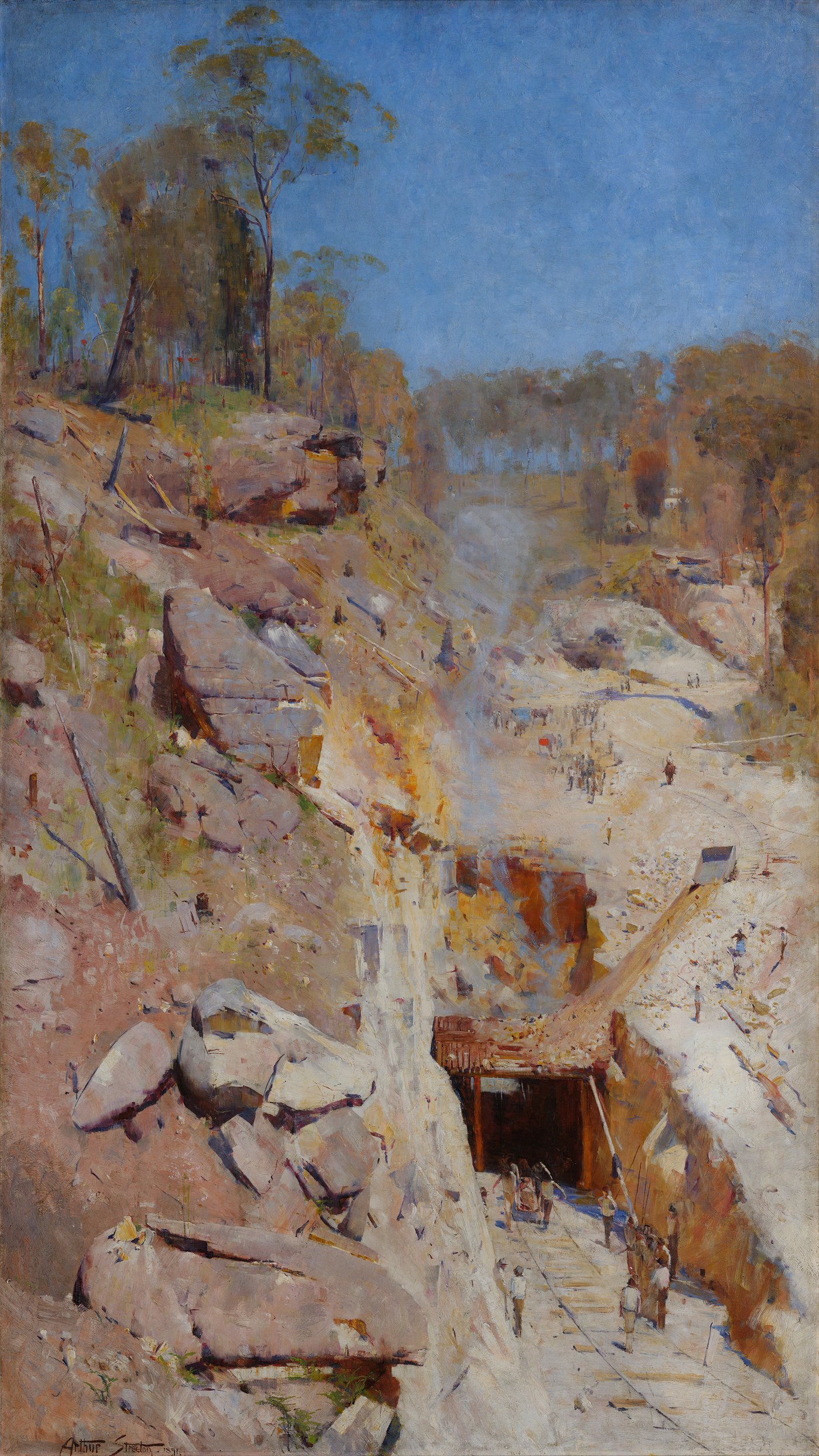Streeton transforms industrial labor into a powerful landscape drama. The steep drop, scattered stone, and drifting smoke create a sense of tension and scale, emphasizing how fragile people appear against the forces they unleash. Painted in the late nineteenth century, the work reflects a time of expansion and extraction, when progress meant reshaping the land. Yet Streeton does not glorify the scene. Instead, he presents it with clarity and realism, showing both human effort and the quiet risk that comes with it.