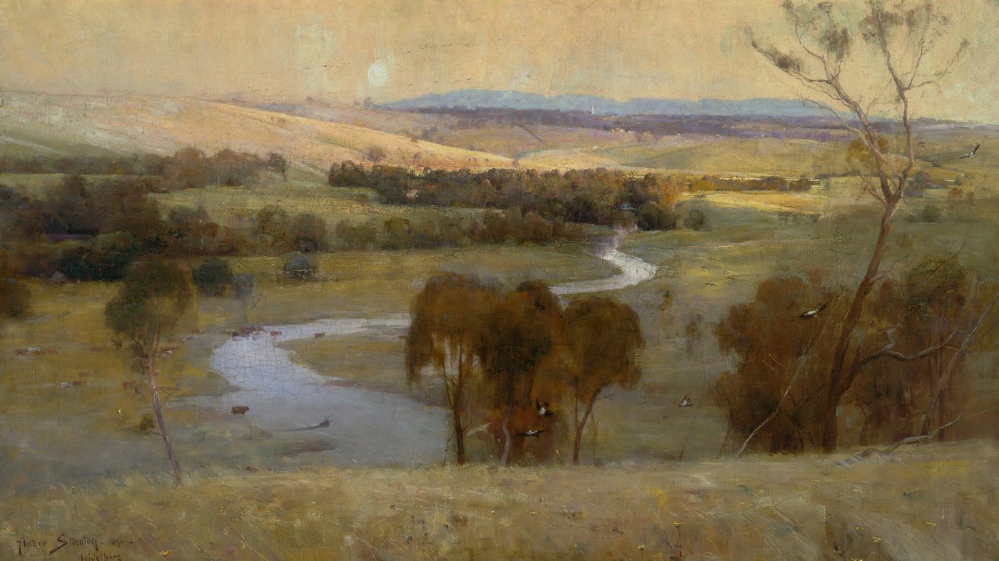 Arthur Streeton’s Still Glides the Stream, and Shall for Ever Glide captures a moment of deep calm in the Australian landscape. A wide river moves slowly through open land, its surface catching light in a way that feels timeless and unbroken. The banks are low and gentle, and the surrounding trees and sky seem to lean quietly into the scene. There is no clear action or focal event. The painting rests on stillness and continuity.