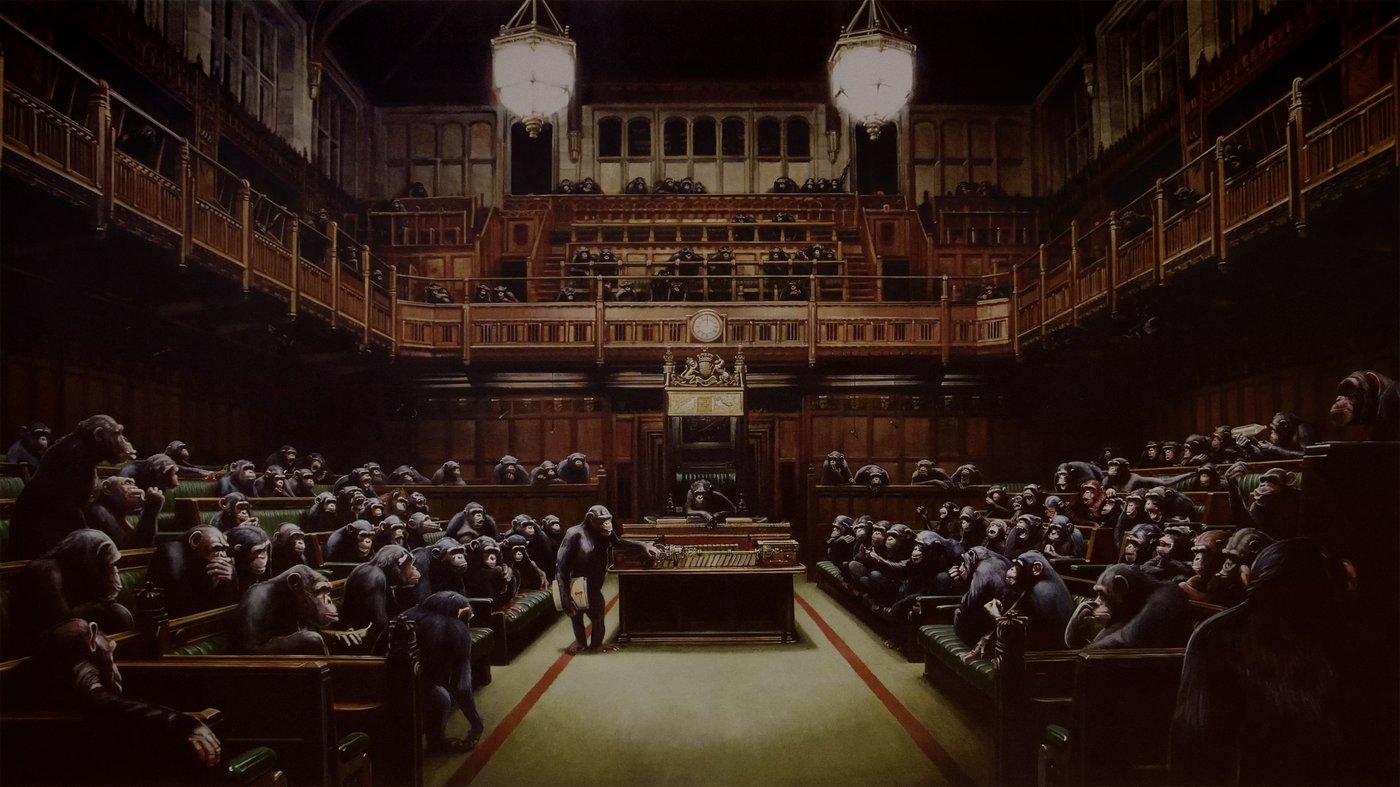 This striking painting by the elusive street artist Banksy reimagines Britain's House of Commons with chimpanzees occupying the green benches instead of politicians. Created in 2009 and later updated in 2019, the work takes direct aim at parliamentary politics, suggesting that the debates and decisions happening in this grand chamber might not be all that evolved. The title plays on the concept of "devolved" government, where power is distributed to regional bodies, while also implying a backward slide in political discourse.
