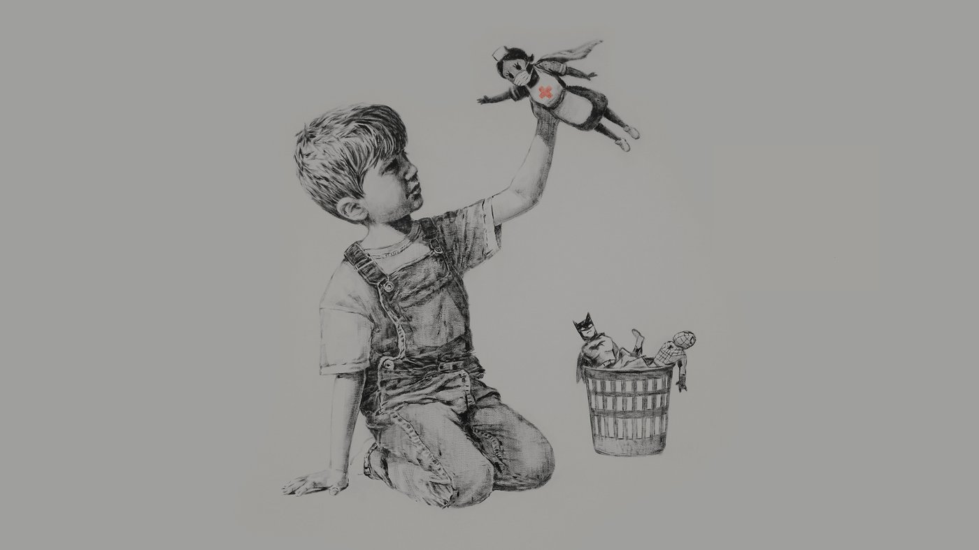 The image captures a simple but powerful shift in perspective about who our real heroes are. While superhero toys sit forgotten in the basket, the child has chosen to celebrate the everyday courage of medical workers instead. Banksy later sold the work at auction for over 16 million pounds, with proceeds going to NHS charities and health organizations. It's a touching example of how street art can respond directly to current events and honor the people who matter most during difficult times.