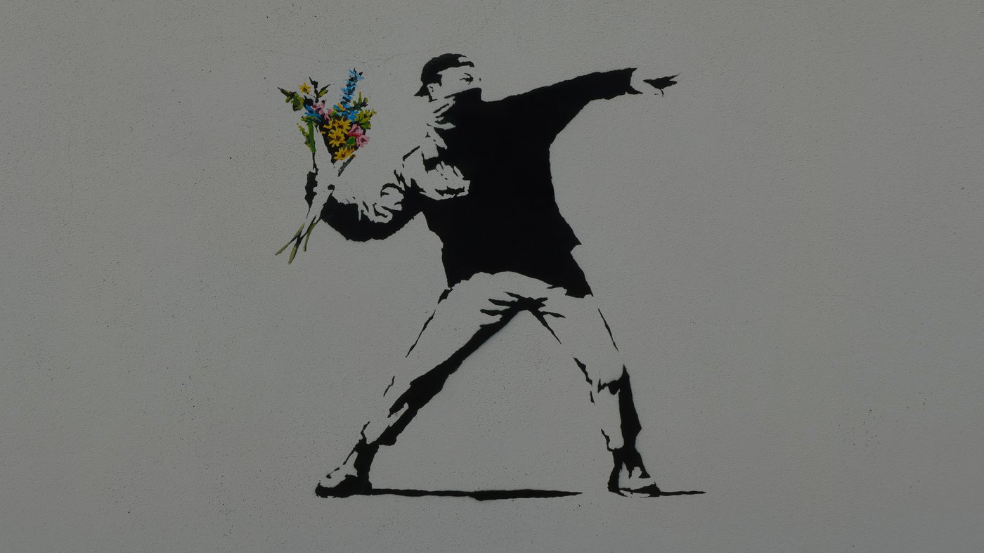 This iconic stencil piece shows a masked protester caught in the act of throwing something, but instead of a weapon or rock, he's hurling a bouquet of colorful flowers. The figure's aggressive stance and bandana-covered face suggest violence and rebellion, yet the bright blooms create an unexpected and almost humorous contradiction. It's classic Banksy, flipping our expectations and making us rethink the relationship between protest, aggression, and love.