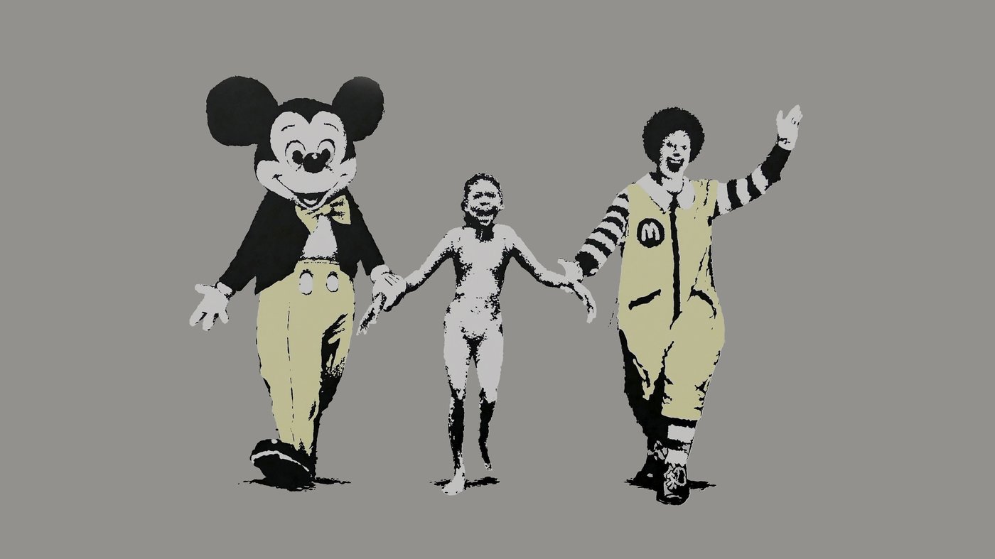 Banksy, the anonymous British street artist, created this work in 2004 as part of his ongoing critique of consumer culture and political power. By pairing one of the most haunting images of the 20th century with beloved brand characters, he forces viewers to confront uncomfortable questions about how commercial interests and popular culture can sanitize or distract from real human suffering. The piece retains his signature stencil style, rendered here in a limited palette that keeps the focus on the jarring juxtaposition at its core.
