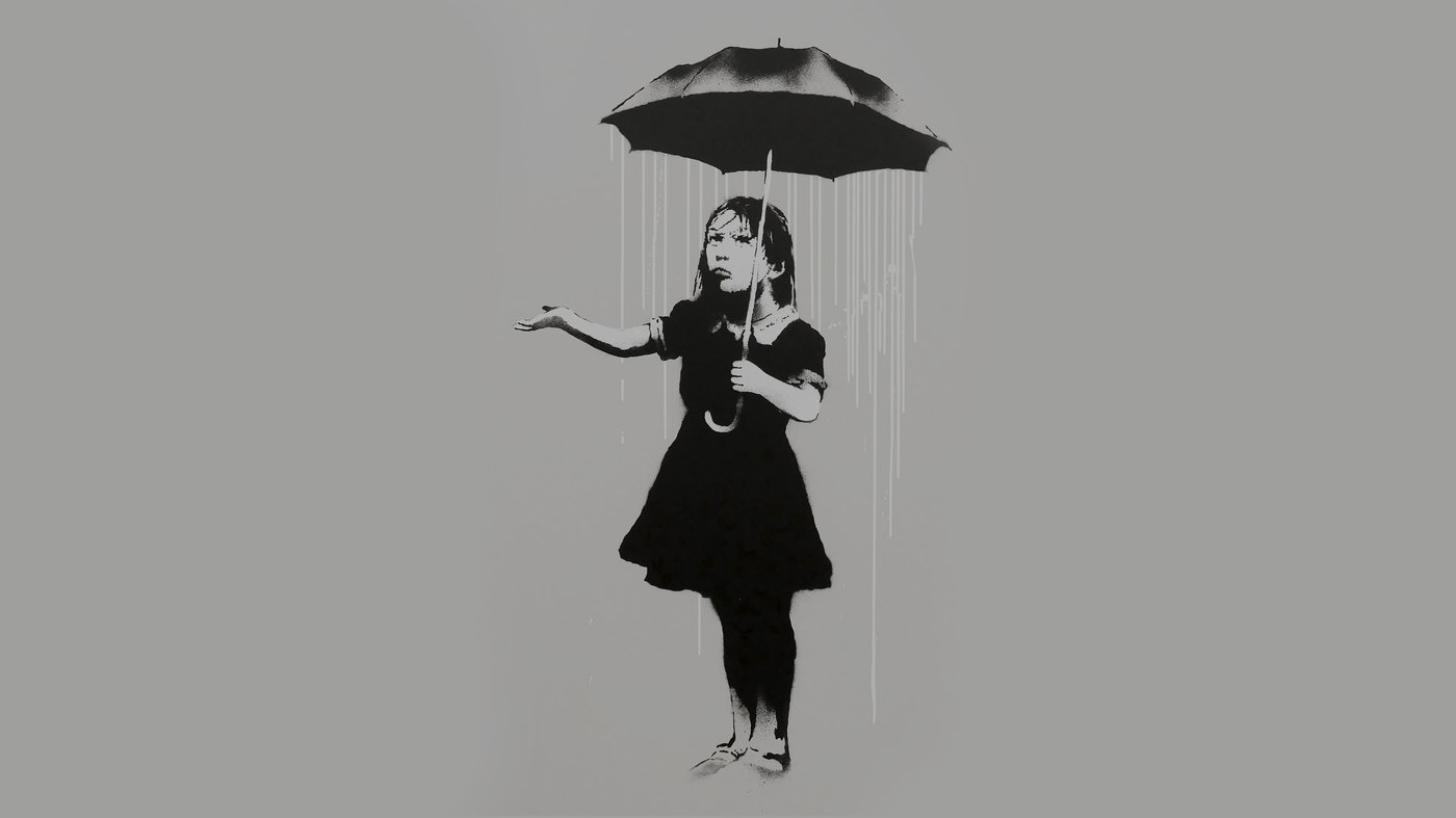 This stenciled silhouette of a young girl standing beneath an umbrella appears deceptively simple at first glance, but it captures Banksy's signature blend of whimsy and social commentary. The vertical lines beneath the umbrella suggest rain, yet there's something slightly off about the scene that makes you look twice. Created in New Orleans after Hurricane Katrina, this piece takes on deeper meaning when you consider the context of a city devastated by flooding and governmental neglect.