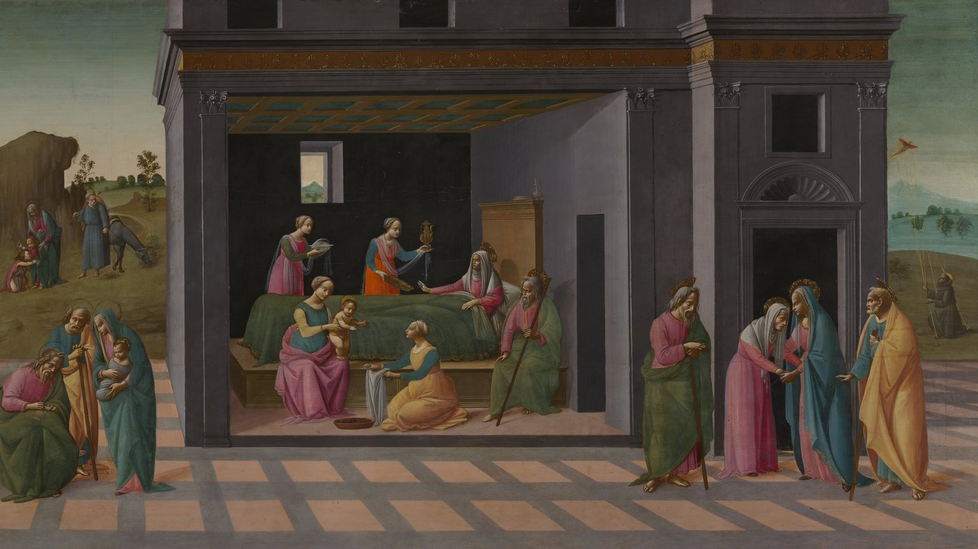 This Renaissance painting tells the story of Saint John the Baptist through multiple scenes arranged within a single architectural setting, a popular storytelling technique of the period. The dark interior room serves as a stage where we see John's birth being attended to by women gathered around his mother Elizabeth, who rests in bed after childbirth. Meanwhile, other episodes from his life unfold simultaneously in the surrounding spaces and landscapes, creating a kind of visual narrative that unfolds like panels in a comic book.