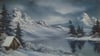 This peaceful winter scene captures the kind of serene mountain landscape that Bob Ross made famous during his long-running television series "The Joy of Painting." A small wooden cabin sits nestled among snow-laden evergreens, its roof blanketed in white, while majestic snow-capped peaks rise dramatically in the background. A partially frozen stream winds through the composition, its dark water reflecting the moody sky above and creating a striking contrast against all that pristine snow.