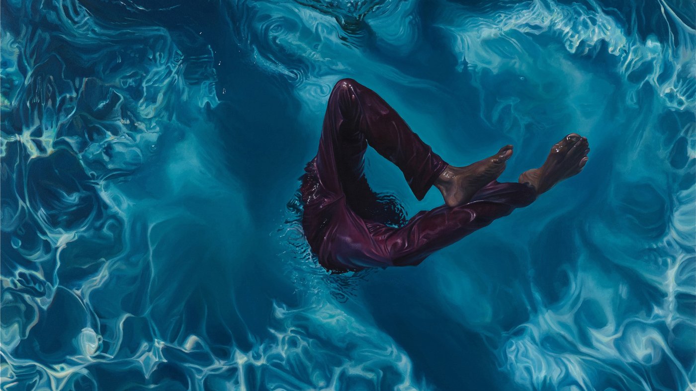 Here we see someone suspended in brilliant turquoise water, their body captured in a moment of stillness that feels both peaceful and weightless. Calida Rawles is a contemporary artist known for her stunning hyperrealistic paintings that explore Black figures in water, using the pool as a space of meditation, freedom, and reclamation. The rippling surface above creates mesmerizing patterns of light that dance across the scene.