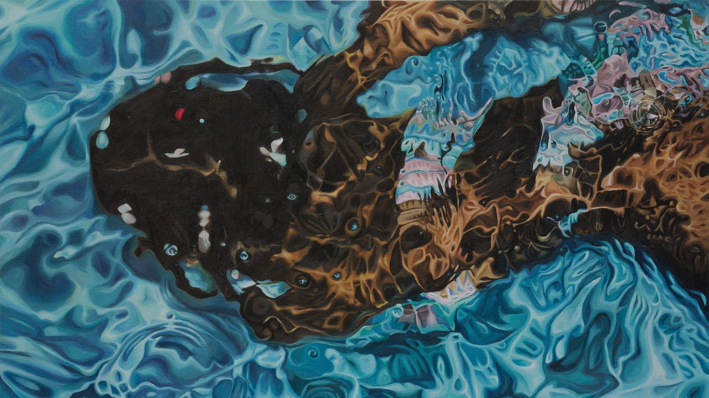 This striking painting captures a figure floating underwater, their body suspended in a mesmerizing swirl of turquoise pool water. Calida Rawles uses water as both subject and symbol, exploring themes of Black identity, freedom, and healing. The way she renders the rippling, distorted reflections and light dancing across the swimmer's skin shows incredible technical skill while creating an almost dreamlike atmosphere.