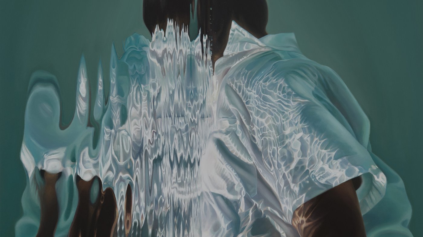 Water in Rawles' work carries deep historical and emotional weight, referencing both the trauma of the Middle Passage and the reclamation of space and freedom. The way the water distorts and fragments the figure creates an almost ghost-like quality, as if the person is caught between worlds or in a moment of transformation. There's something both peaceful and unsettling about the image, the fluid forms freezing mid-motion like sculptural ice formations surrounding the body. The teal-green background adds to this otherworldly atmosphere, suggesting depth and mystery beyond what we can see.