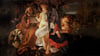 This painting captures a tender moment from the biblical story of Mary, Joseph, and baby Jesus fleeing to Egypt to escape King Herod. Caravaggio painted it early in his career, and you can already see hints of the dramatic lighting he'd become famous for. What makes this version unusual is the angel in the center, who's turned away from us while playing violin. Joseph, looking tired and weathered, holds up a sheet of music for the angel to read from.