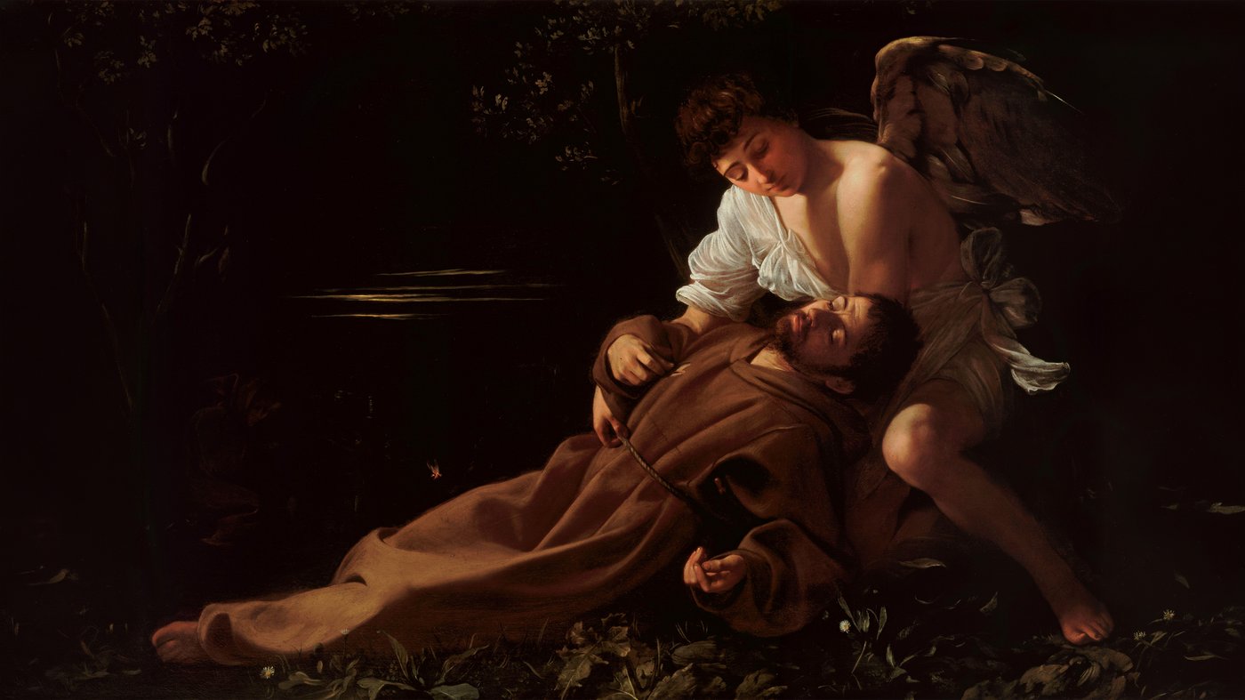 This powerful painting captures Saint Francis at a moment of profound spiritual rapture, supported by an angel as he appears to lose consciousness in divine ecstasy. Caravaggio painted this around 1595, during his early years in Rome, using his signature dramatic lighting technique called chiaroscuro to pull the figures out of deep shadow. The saint's limp body and exposed torso create an almost startling sense of vulnerability and intimacy with the supernatural.