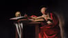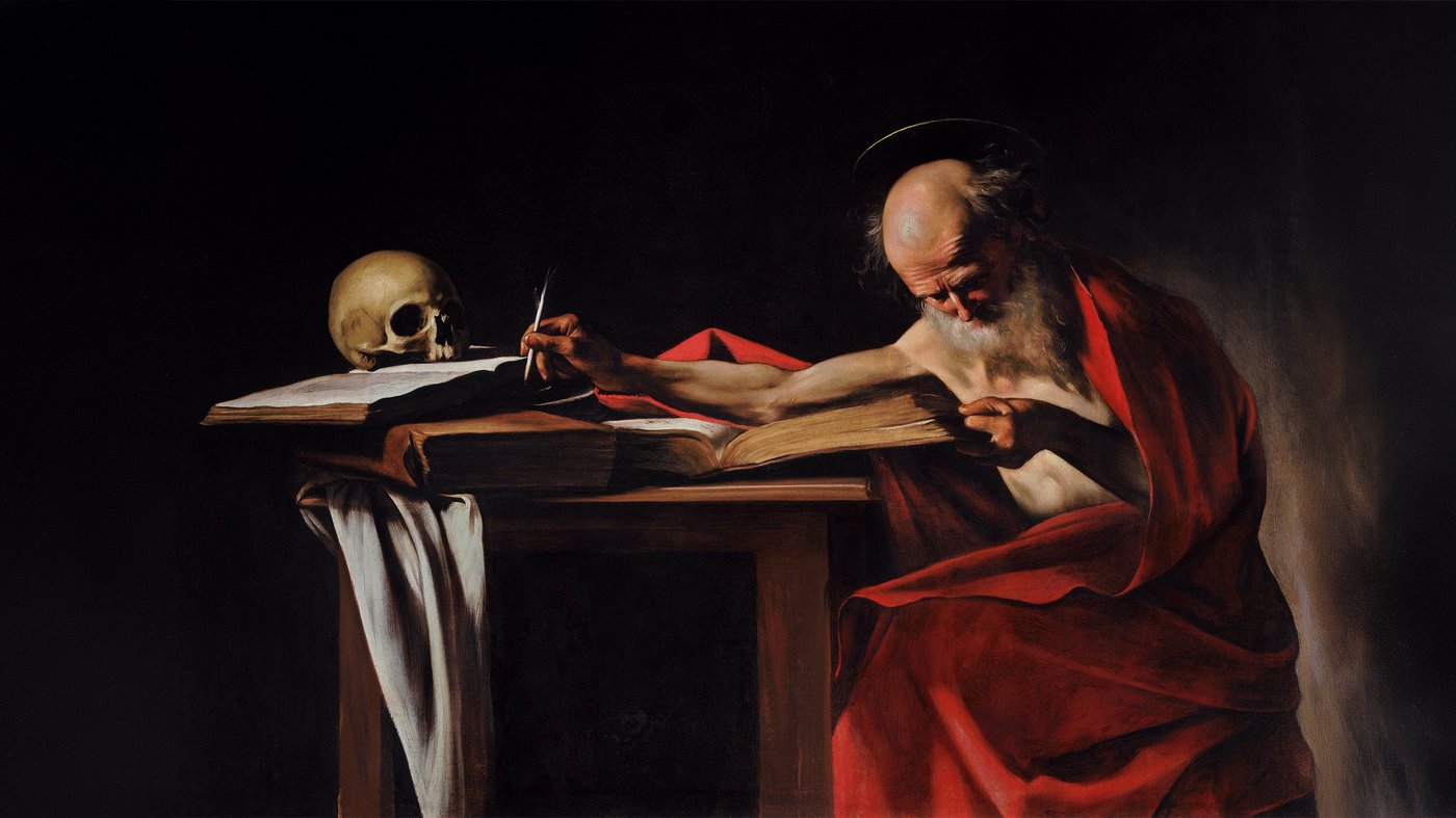 This dramatic painting captures Saint Jerome, the scholar who translated the Bible into Latin, deep in concentration at his desk. Caravaggio painted this around 1605-1606, using his signature style of intense contrasts between light and dark. The elderly saint, draped in rich red robes, leans over an enormous book with a quill in hand, while a human skull rests nearby as a reminder of mortality. The skull was a common symbol in Jerome's portraits, referencing both his scholarly work and his time spent living as a hermit in the desert.