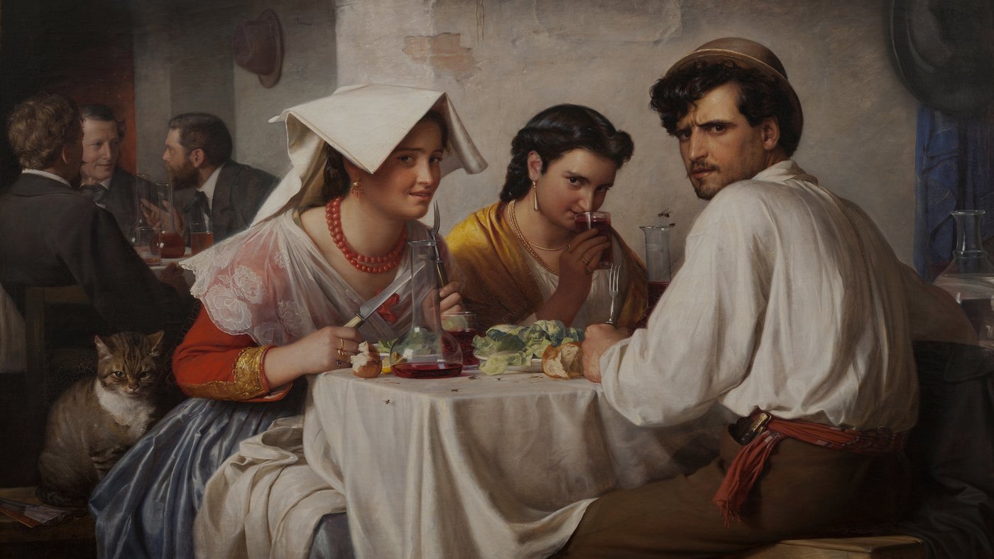 This lively scene captures a casual moment in a Roman tavern, painted by Danish artist Carl Bloch in the mid-1800s. It captures a group of three people in the foreground making direct, engaging, and somewhat confrontational eye contact with the viewer, creating a sense of interrupted drama or secret sharing.