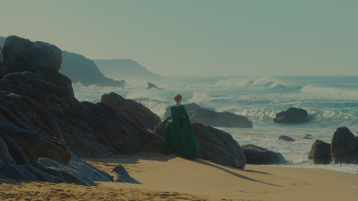 The composition feels like a painting itself, which is fitting given the film's deep engagement with art and the act of looking. The solitary figure in a flowing green cape stands small against the rugged shoreline, caught between the solid earth and the restless sea. Sciamma's cinematography deliberately echoes the muted, naturalistic palette of 18th century portraiture, creating images that feel both timeless and intensely present. The film became celebrated for its visual poetry and the way it explores themes of memory, desire, and the feminine gaze.