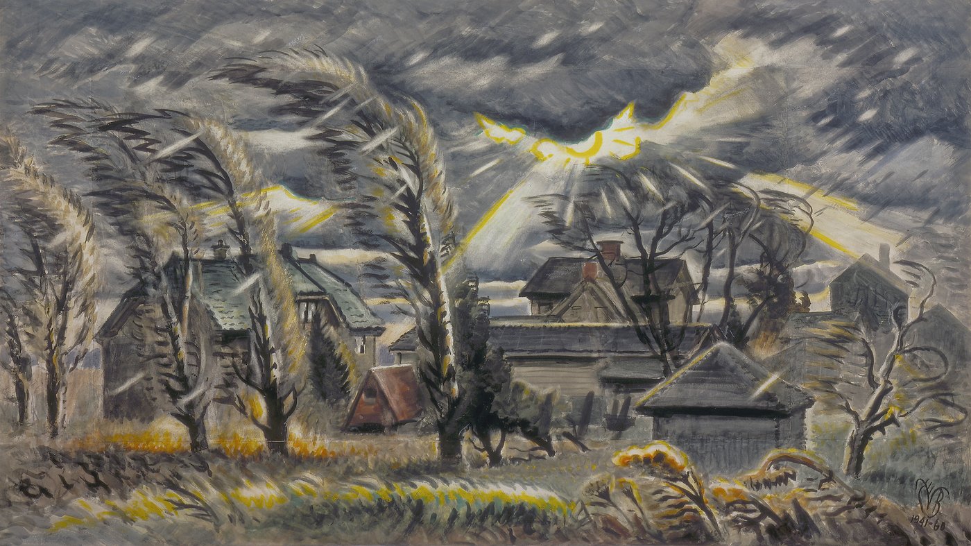 Charles Burchfield painted this in his characteristic expressive style, where nature isn't just observed but felt. He had a special gift for making weather seem almost alive, with personality and force. The bent trees and agitated sky aren't merely decorative but convey the actual physical sensation of being caught in a December tempest. You can almost feel the cold wind and hear it howling through the branches as a solitary horse and figure brave the elements in the middle distance.