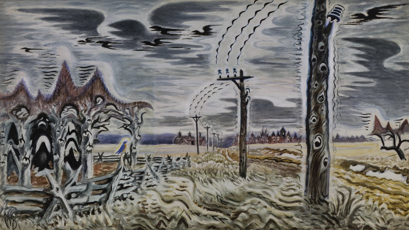 This haunting landscape transforms an ordinary rural scene into something almost supernatural. Charles Burchfield, an American watercolorist known for capturing the soul of small-town life, painted telegraph poles and wires as if they were living, breathing creatures. The undulating lines rising from the poles aren't just artistic flourishes, they're his attempt to visualize sound itself, the eerie hum and song of electricity traveling through wires across the empty countryside.