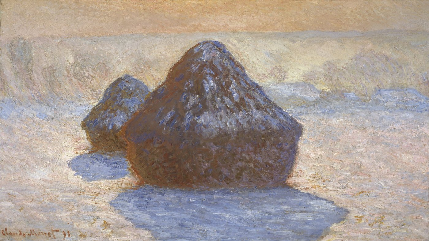 This painting is part of the haystacks series that Claude Monet worked on in the early 1890s. Rather than changing the subject, Monet changed the conditions, painting the same stacks again and again in different light, weather, and seasons. Here, snow transforms the familiar into something almost monumental. The work is less about agriculture than about perception, showing how light and atmosphere can reshape the way we see even the most ordinary things.