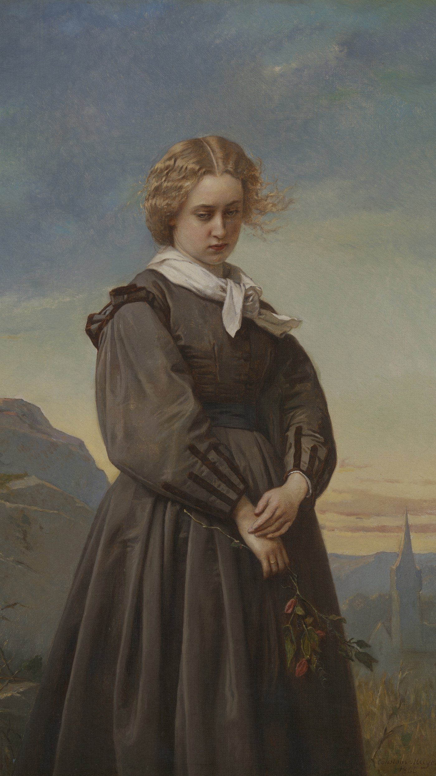 This contemplative portrait captures a young woman in traditional dress holding a delicate branch of withered roses, her gaze cast downward in a moment of quiet sadness. Painted by Constant Mayer, a French-American artist working in the mid-19th century, the work embodies the Romantic era's fascination with emotion and symbolism. The dying flowers she holds aren't just decorative; they're a clear symbol of fading love or lost romance, giving the painting its melancholic title.