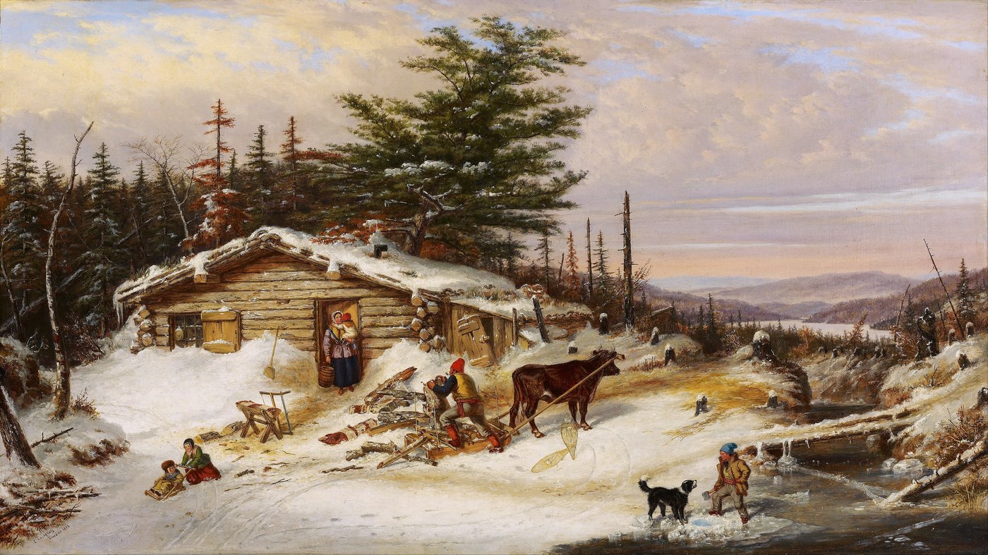 This painting, "Settler's Log House", isn't just a pretty winter scene; it captures a specific moment in Canadian history—the hard, lonely life of early European settlers.