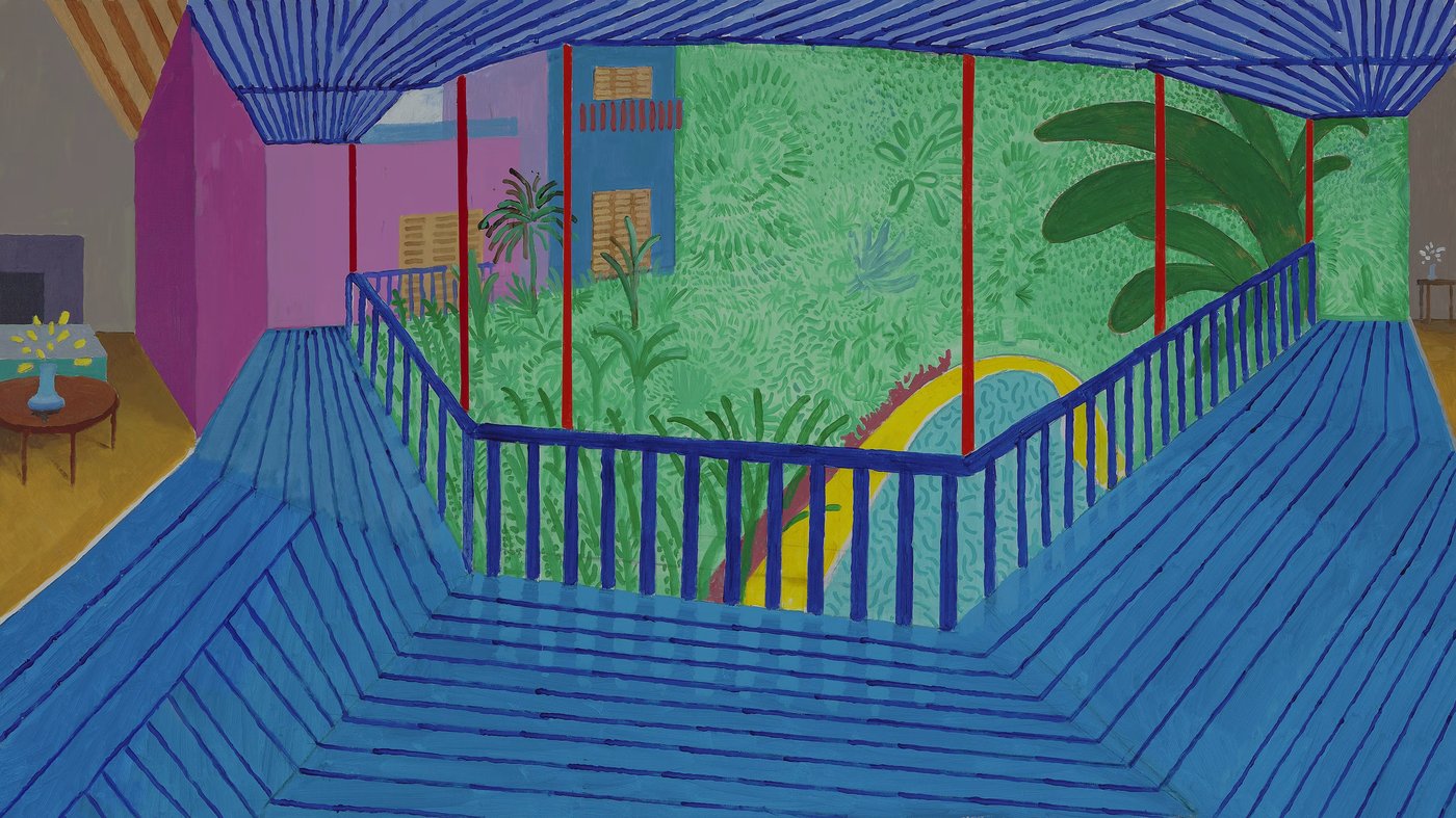 Hockney painted this work in the 1980s when he was experimenting with unconventional viewpoints and multiple perspectives, influenced partly by his study of Cubism and Chinese scroll paintings. The electric blue and vivid greens aren't meant to be realistic but rather express the artist's emotional response to the space and light. Notice how the floor seems to pull your eye through the room toward that tropical garden beyond, creating an almost theatrical sense of space that feels both inviting and slightly disorienting at the same time.