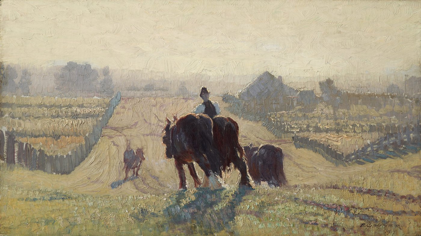 Elioth Gruner’s Frosty Sunrise captures the quiet transition from night to day on a cold rural morning. Pale light spreads slowly across fields and fences, softening the frost that still clings to the ground. A figure on horseback moves forward at an unhurried pace, accompanied by animals that seem equally calm and accustomed to the cold. The air feels still, and sound seems muted, as if the world has not fully woken yet.