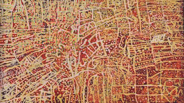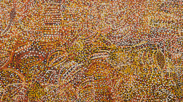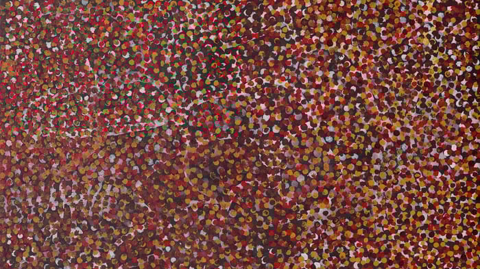 This exuberant painting comes from Emily Kame Kngwarreye, an Aboriginal Australian artist who didn't begin painting until she was in her seventies but went on to create thousands of works in the final years of her life. The title "Anwerlarr angerr" refers to the pencil yam, a vital food source in her ancestral lands of Utopia in Central Australia, and the ceremony associated with it. What you're seeing is both a celebration of the land and a spiritual map of her country.