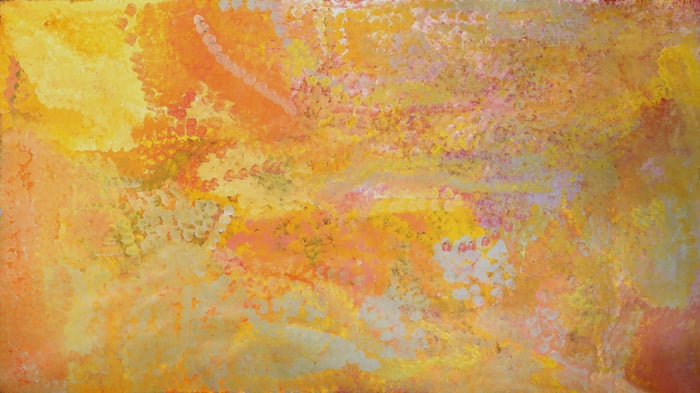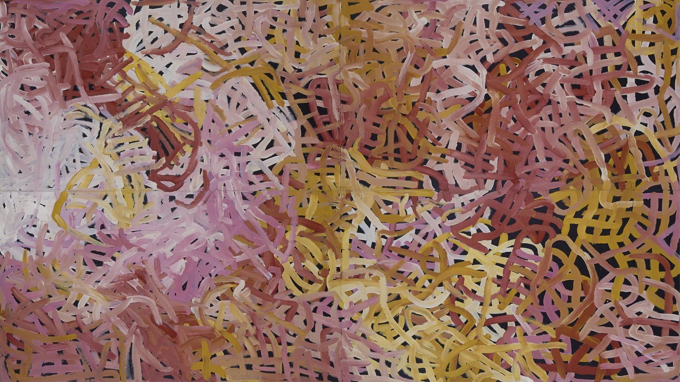 Kngwarreye's distinctive style evolved dramatically throughout her career, and here she uses an intricate lattice of marks and vibrant colors that seem to shimmer across the canvas. The overlapping layers of pink, yellow, white, and earthy tones create a sense of movement and energy, as if the landscape itself is breathing. Rather than depicting the yam plant literally, she captures its essence and the stories connected to it through this rhythmic pattern of lines and dots, a visual language developed over thousands of years of Indigenous Australian art.