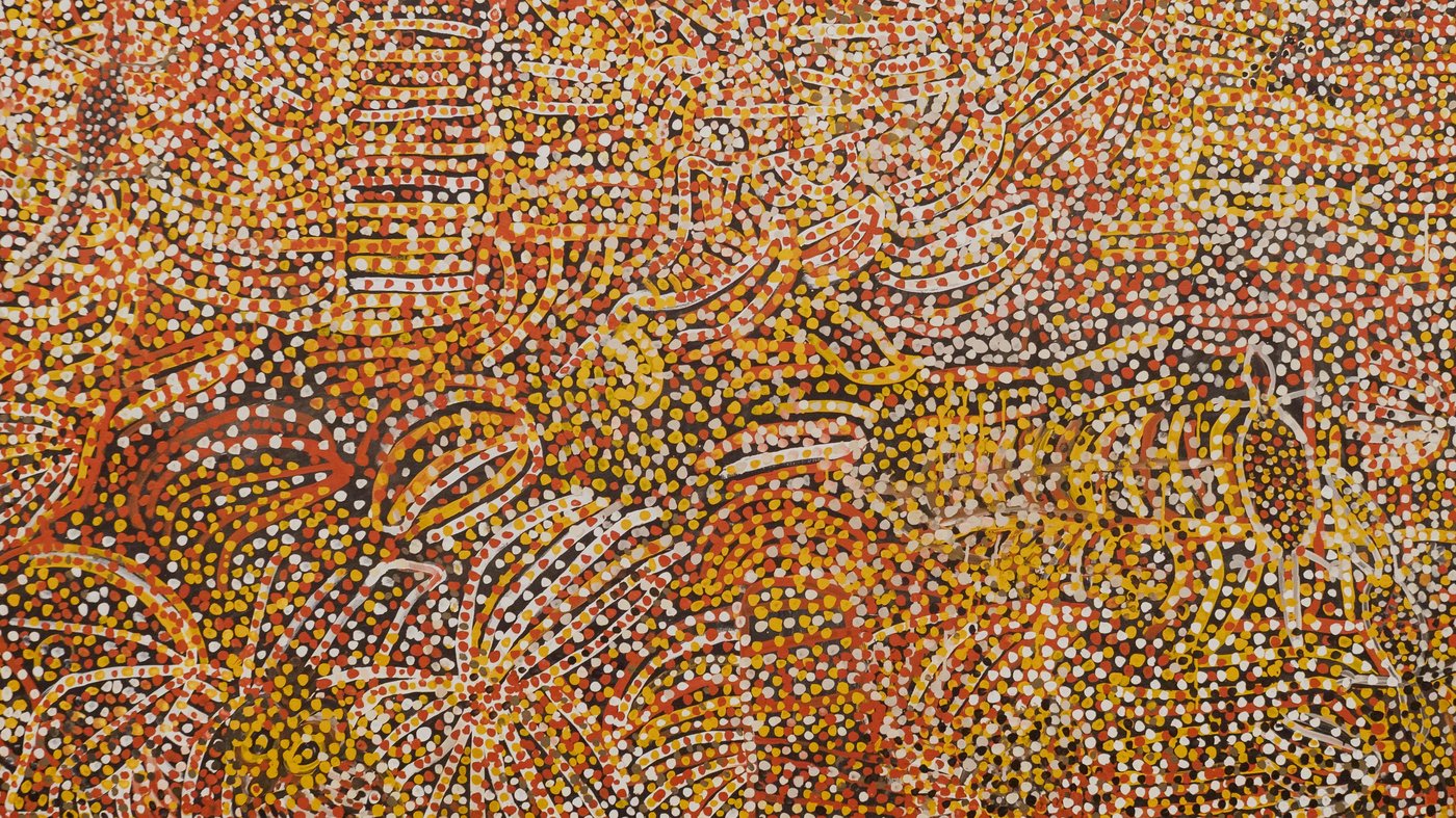 This mesmerizing painting comes from Emily Kame Kngwarreye, an Aboriginal Australian artist who didn't begin painting until she was in her seventies. Working with an extraordinary energy that defied her age, she created thousands of paintings in just eight years, becoming one of Australia's most celebrated contemporary artists. Her work draws from deep connections to her ancestral lands in the Utopia region of Central Australia.