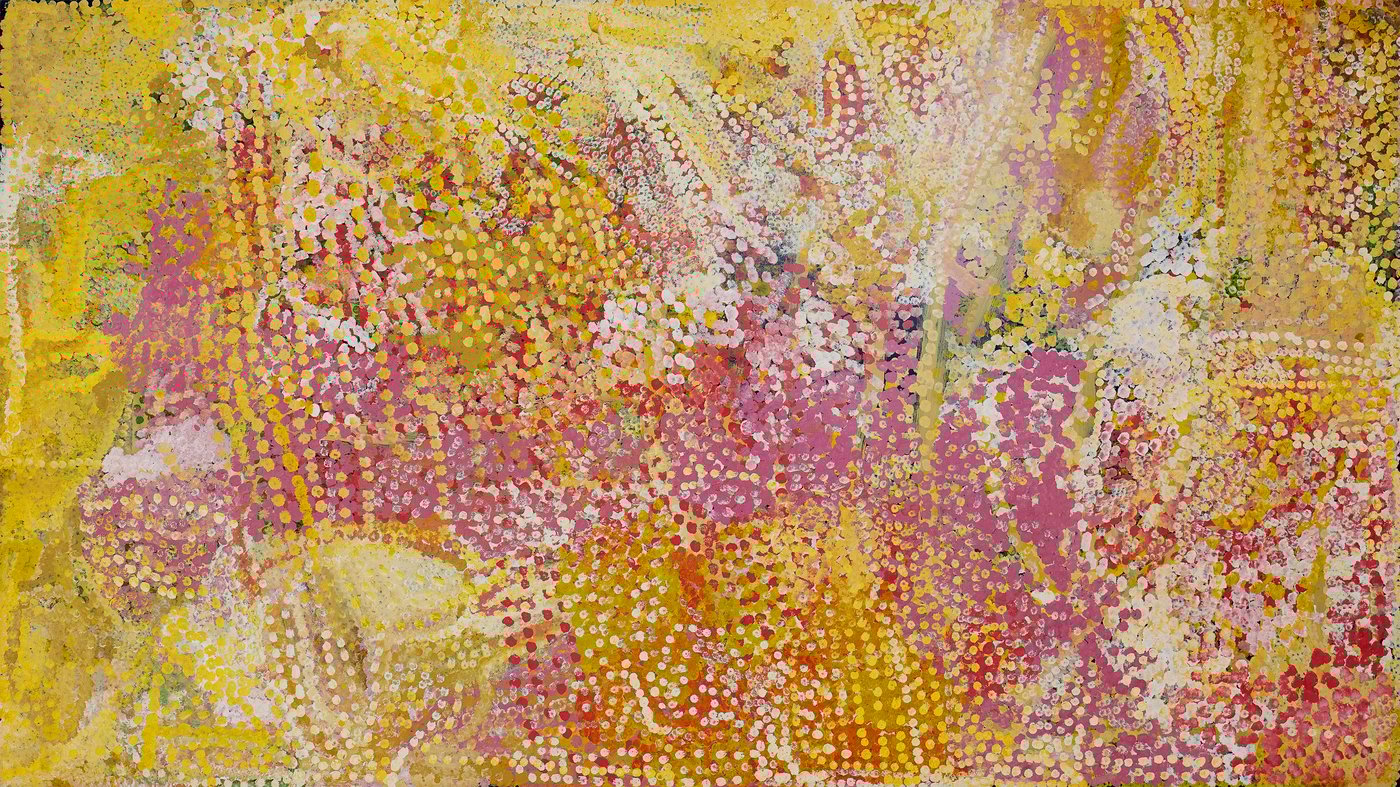 This vibrant painting pulses with countless dots in yellows, pinks, and oranges that seem to shimmer and dance across the canvas. Created by Emily Kame Kngwarreye, an Indigenous Australian artist who didn't begin painting until she was in her seventies, this work reflects the artistic traditions of her Anmatyerre culture from the remote desert region of Utopia, northeast of Alice Springs.