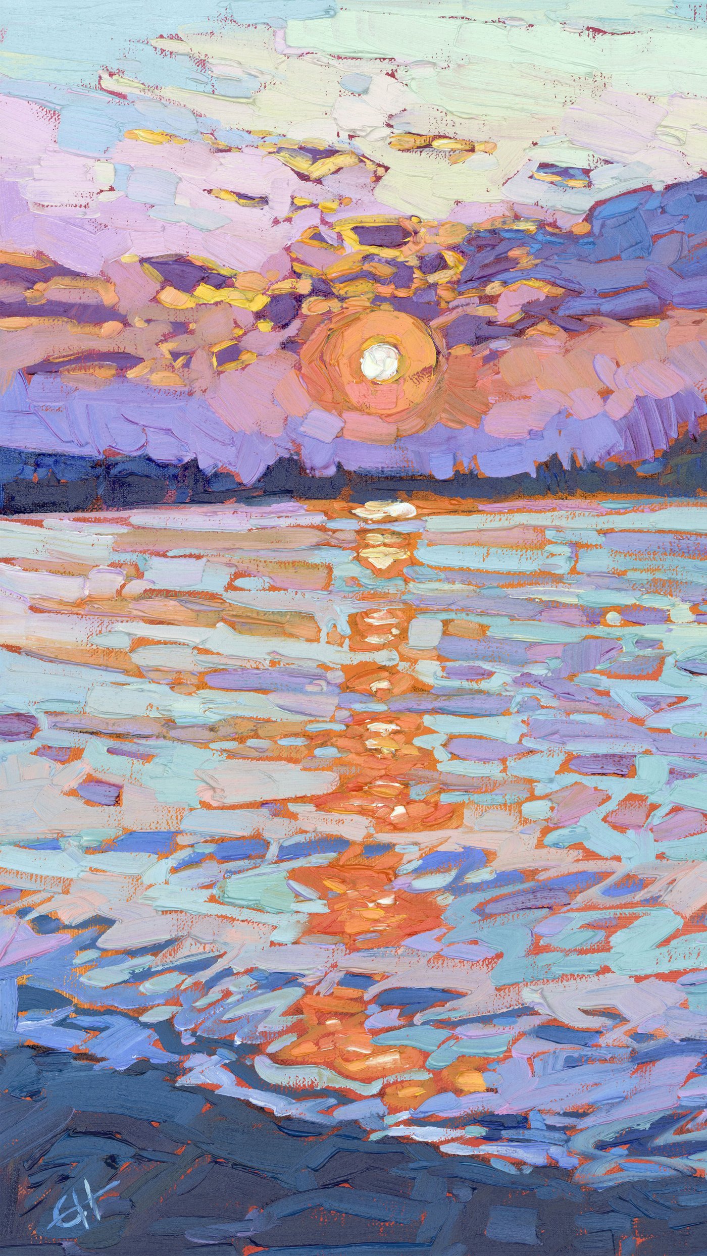 Erin Hanson is known for her "open impressionism" technique, where she applies paint in distinct, unblended strokes that create a mosaic-like effect. The purple and blue clouds seem to dance around the glowing sun, while the water below becomes an abstract pattern of oranges, purples, and blues. This bold use of color and texture gives the painting an almost dreamlike quality, transforming a simple sunset scene into something more dynamic and expressive. The distant shoreline remains purposefully vague, keeping our attention on the interplay of light and color across the water.