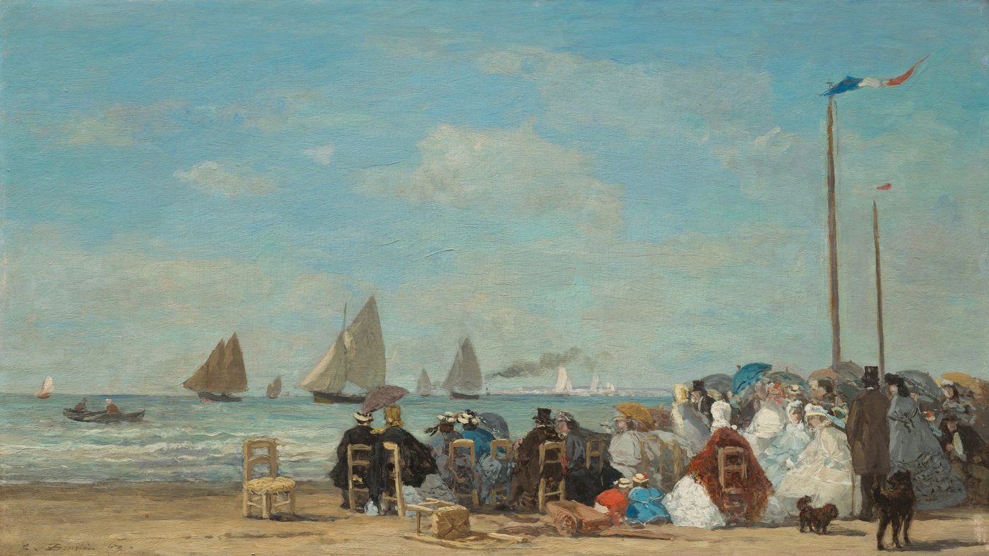 Boudin had a special talent for painting skies and clouds, which take up nearly half of this composition and seem to shift and move with atmospheric light. His loose, sketchy brushwork and attention to natural light would later inspire a young Claude Monet, who credited Boudin as his mentor. Working directly from observation rather than in a studio, Boudin captured these fleeting moments of leisure with an immediacy that helped pave the way for Impressionism. Notice how he's less interested in individual faces and more focused on the overall scene, the play of light on fabric, and the breezy feeling of a day at the seaside.