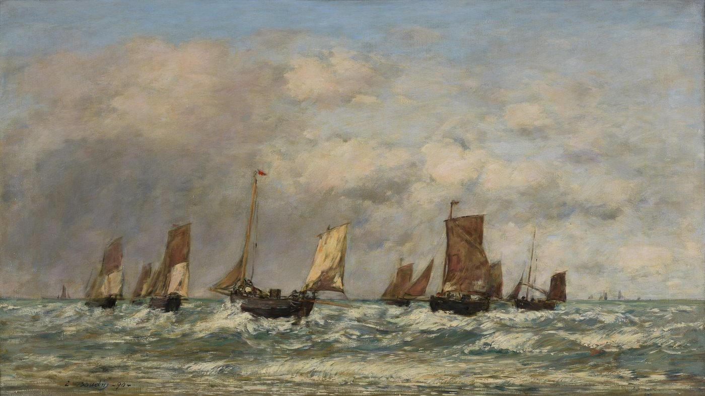 A fleet of fishing boats cuts through choppy waters under a dramatic sky of heavy clouds in this maritime scene by Eugène Boudin, a French painter who dedicated much of his career to capturing coastal life. The boats, with their distinctive brown and cream sails, are heading out to sea from Berck, a fishing village on the northern French coast. Boudin's loose, fluid brushwork brings the waves to life, making you almost feel the salt spray and hear the wind snapping at the canvas sails.