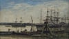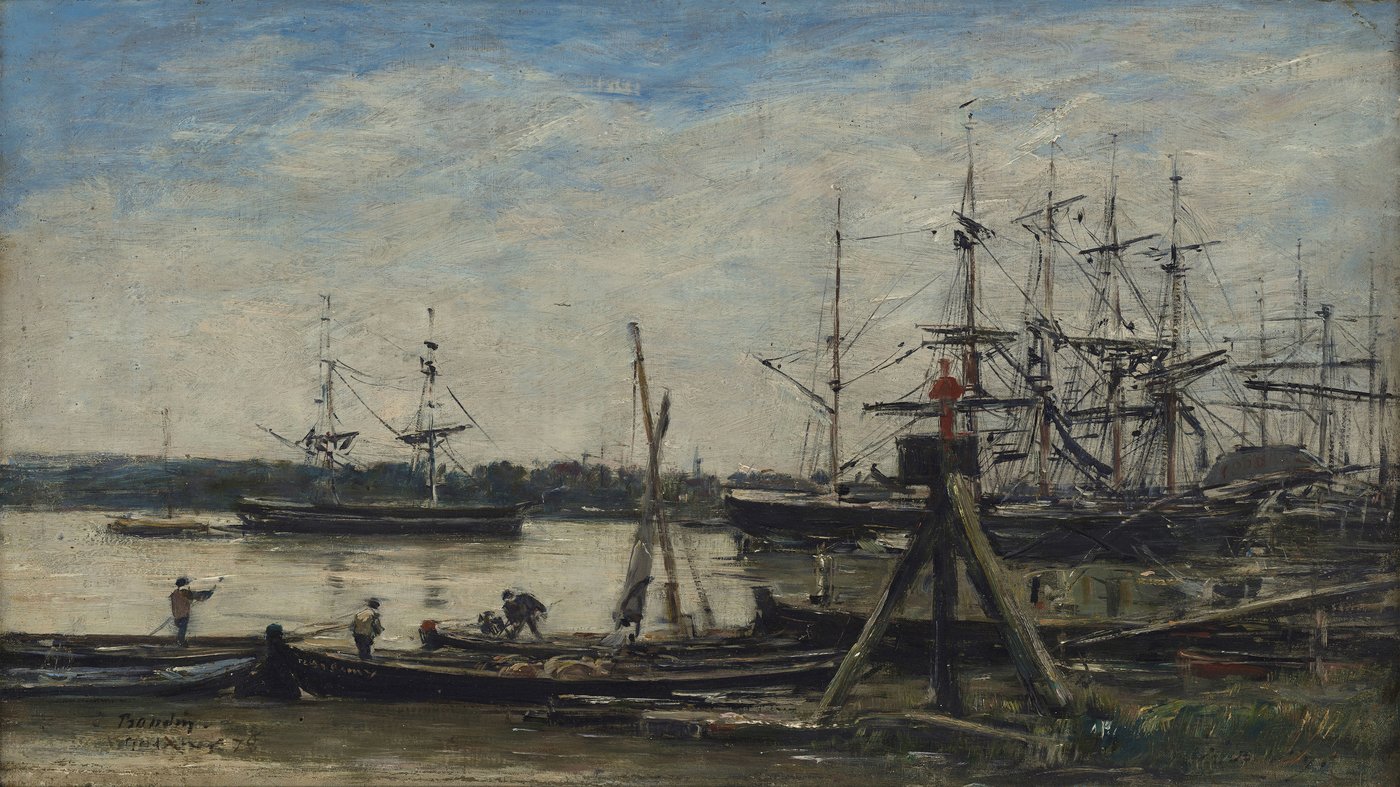 This quiet harbor scene captures the working waterfront of Bordeaux, painted by Eugène Boudin, a French artist who spent his career devoted to coastal and maritime subjects. Boudin had a particular gift for painting skies and water, and you can see that talent here in the soft, cloudy atmosphere that dominates the composition. The tall-masted ships rest peacefully in port while a small group of figures works along the shoreline in the foreground, giving us a sense of the everyday rhythms of port life in 19th-century France.