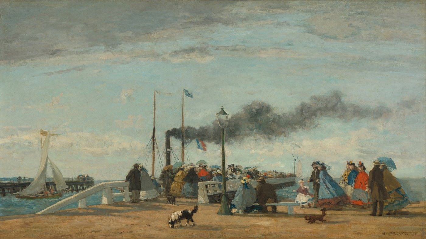 This lively seaside scene captures the bustling jetty at Trouville, a fashionable French beach resort that became wildly popular in the mid-1800s. Eugène Boudin, often called the "king of skies," painted this view with his characteristic light touch, showing elegantly dressed visitors mingling with local workers on the wooden pier. A steamboat chugs past in the background, its dark smoke trailing across the pale sky, while a small dog trots along the weathered planks in the foreground.