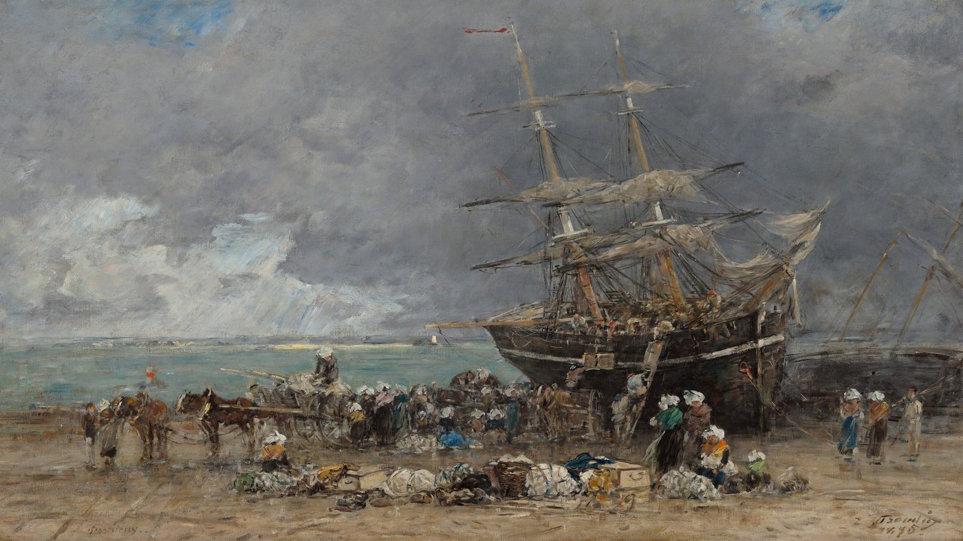 This bustling beach scene captures the arrival of a Terre-Neuvier, a fishing vessel that has returned from the grueling cod fisheries off Newfoundland. Eugène Boudin, best known for his luminous seascapes and cloud studies, brings his characteristic attention to atmospheric conditions here, with stormy gray skies looming over the beached ship. The painting documents a moment of intense activity as workers unload cargo, horses strain under their loads, and figures in traditional Breton dress gather around scattered goods on the sand.