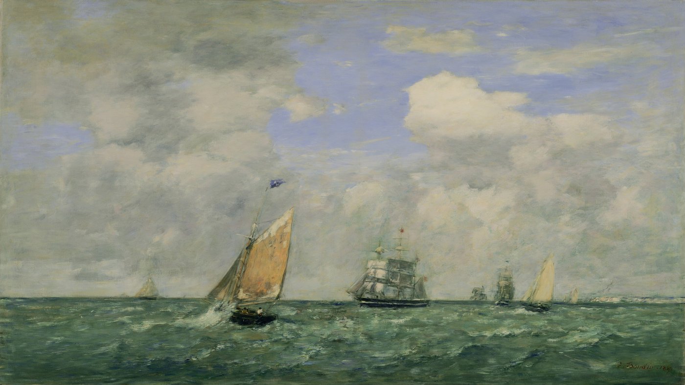 Eugène Boudin was a 19th-century French painter who spent most of his life capturing the coastal scenes of northern France, particularly around Le Havre and the Normandy coast. He had a special gift for painting skies and water, and this scene perfectly demonstrates why his young friend Claude Monet called him "the king of skies." Here, various vessels from humble fishing boats with tan sails to grand multi-masted ships navigate the choppy green waters under a vast, cloudy sky that takes up more than half the canvas.