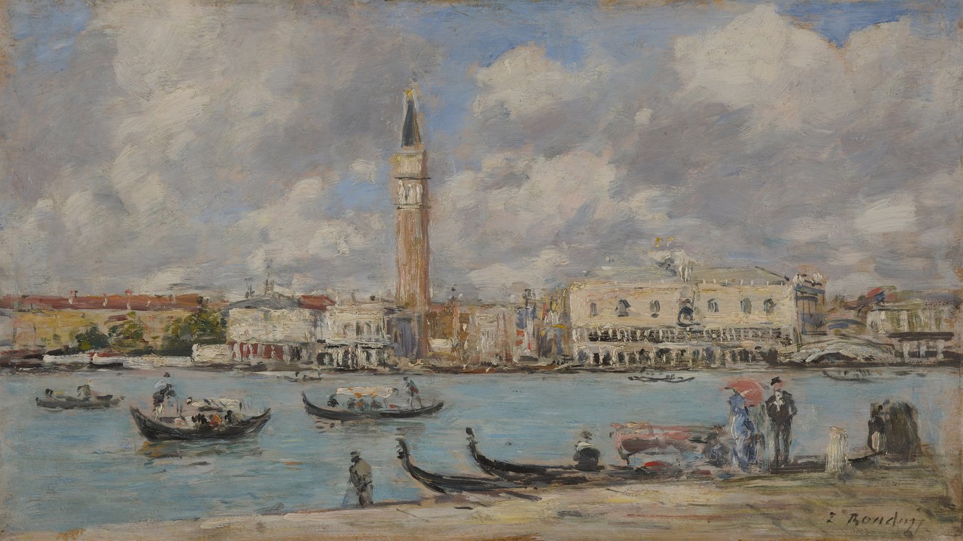 What makes this work particularly appealing is its loose, sketch-like quality. Boudin doesn't get caught up in precise architectural details. Instead, he focuses on capturing the feeling of the place: the way the buildings shimmer across the lagoon, the gondolas bobbing gently in the water, and those wonderful billowing clouds that take up nearly half the canvas. The people on the shore in the foreground are painted with just a few quick brushstrokes, giving us a sense of daily life without fussing over specifics. It's the kind of painting that makes you feel like you're standing right there on the waterfront, squinting across the harbor on a breezy afternoon.
