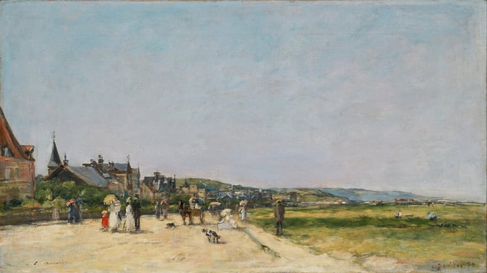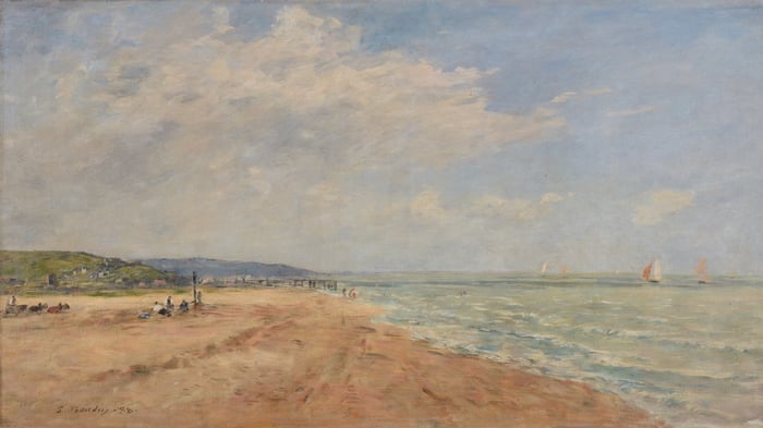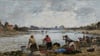 This scene captures the everyday reality of working life along the Touques River in northern France, where washerwomen have gathered to do their laundry in the traditional way. Eugène Boudin, a pioneering figure in outdoor painting, was known for his dedication to painting ordinary people going about their daily tasks. He's especially celebrated for his atmospheric skies, and you can see that talent here in the sweeping clouds that dominate the upper half of the canvas.
