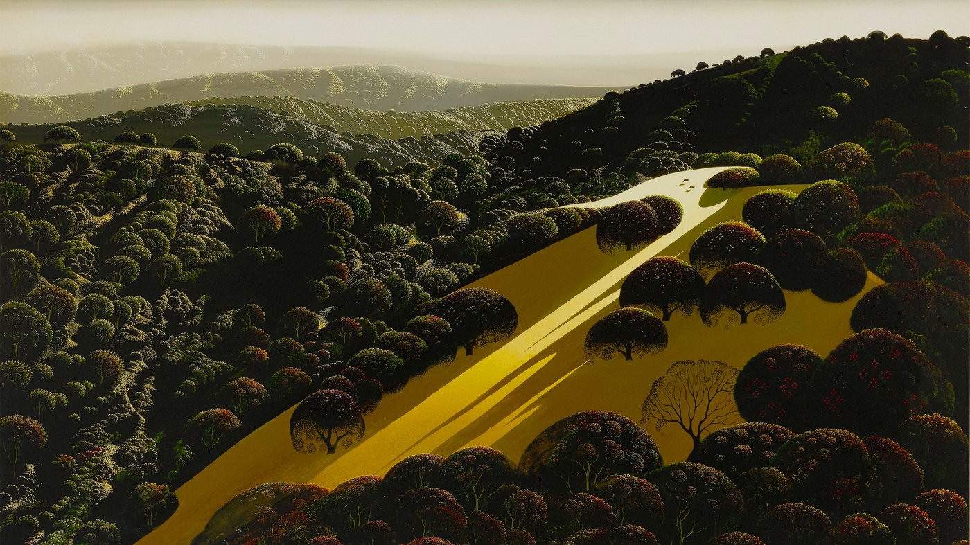 This dreamlike landscape shows a golden river winding through rolling hills covered in rounded, stylized trees that look almost like giant broccoli florets. The artist, Eyvind Earle, is best known for designing the backgrounds for Disney's "Sleeping Beauty," and you can see that same magical quality here in how he transforms nature into something both recognizable and fantastical. The warm, glowing light suggests either dawn or dusk, giving the whole scene an otherworldly atmosphere.