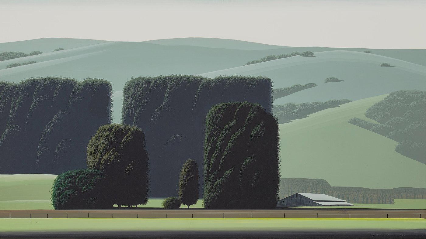 This painting captures the rolling hills of California's Santa Ynez Valley with the distinctive geometric precision that made Eyvind Earle famous. Best known for his background work on Disney's "Sleeping Beauty," Earle developed a signature style that simplified nature into bold, architectural forms. Here, massive rectangular hedgerows stand like dark sentinels against pale green hills, their sculptural presence creating an almost surreal landscape that feels both realistic and dreamlike.