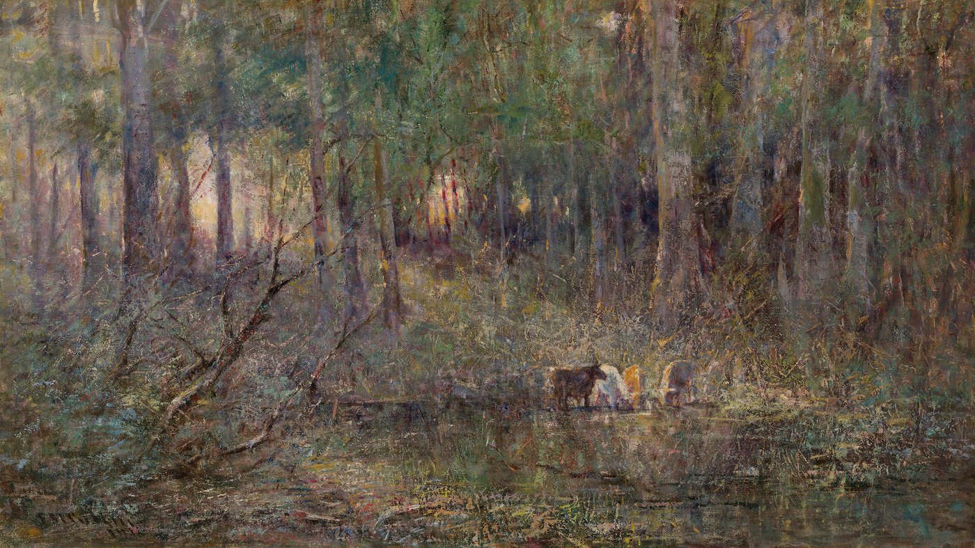 Painted during a period when artists were seeking to define an Australian identity through the land, the work focuses less on narrative and more on mood. McCubbin uses color to express atmosphere and emotion, letting light become the main subject. Violet and Gold reflects a deep respect for the landscape, presenting it as something enduring, calm, and quietly powerful, where beauty lies in stillness and open space rather than action.