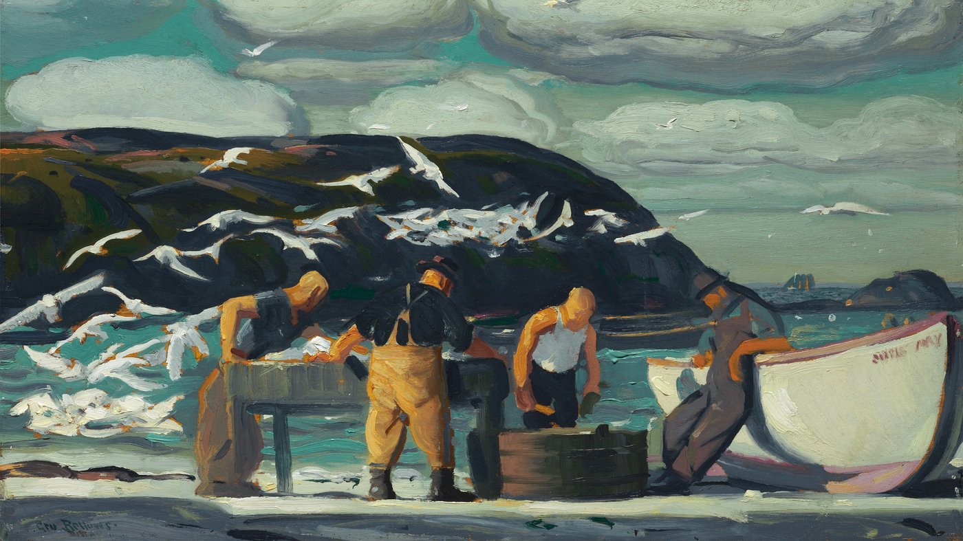 This painting shows a quiet moment of daily labor along the coast. Three fishermen bend over their work while gulls swirl above them, waiting for scraps. The light is soft but steady, giving the scene a sense of rhythm, as if this task has been repeated countless times. Bellows focuses on the connection between people and place, showing how the sea shapes both their routines and their community.