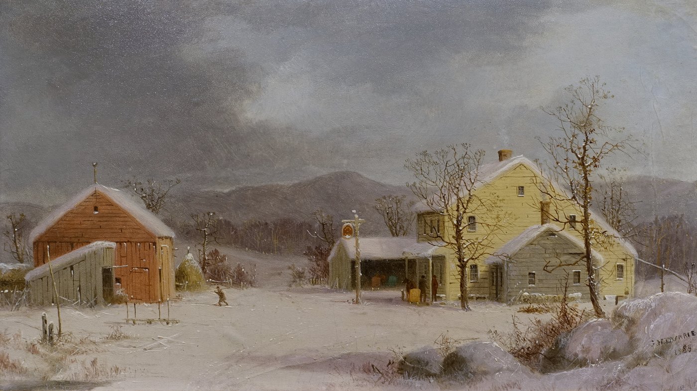 Painted by George Henry Durrie, this work reflects a 19th century American ideal of rural life shaped by community, resilience, and seasonal rhythm. Durrie was known for his winter scenes, often drawn from New England villages he knew well. Rather than presenting winter as harsh or isolating, he shows it as familiar and lived in. The painting carries a sense of quiet order, where daily life continues steadily, framed by snow, light, and a shared sense of place.