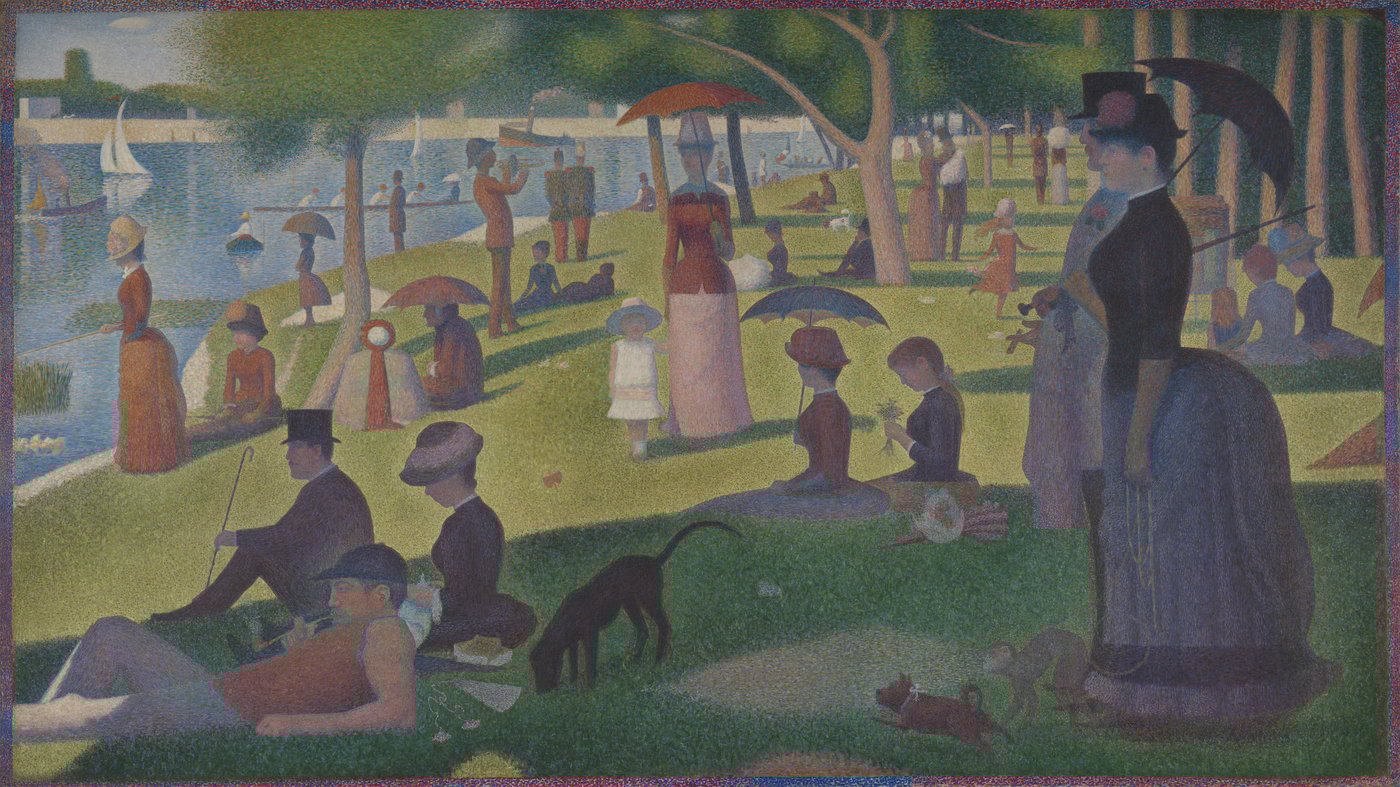 Seurat was fascinated by color theory and wanted to paint in a more scientific way. Rather than mixing paints on a palette, he placed dots of complementary colors side by side, letting the viewer's eye do the mixing. The painting shows a cross-section of Parisian society, from fashionable ladies with parasols to working-class people enjoying their day off. That distinctive monkey on a leash was actually a trendy pet accessory at the time. The careful composition and the stillness of the figures transform an ordinary park scene into something that feels both modern and classical, like a freeze-frame of everyday life elevated into something monumental.