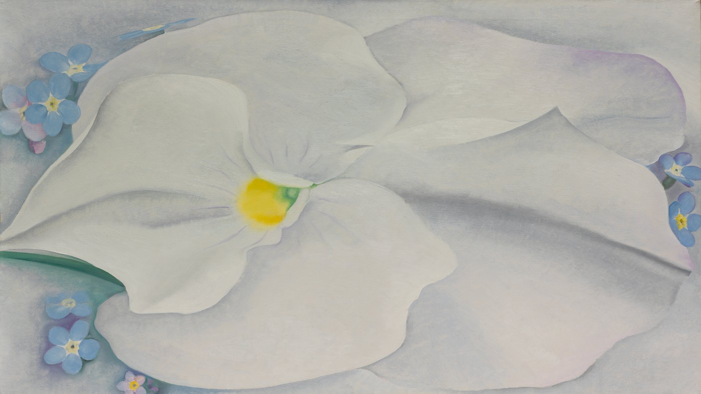 This luminous painting showcases Georgia O'Keeffe's signature approach to flowers, zooming in so close that a single white pansy becomes an almost abstract landscape of soft, flowing forms. The delicate petals unfold across the canvas like gentle waves of fabric, their subtle shadows and curves creating a sense of quiet intimacy. A small yellow center anchors the composition, while tiny blue forget-me-nots peek in from the edges, providing just enough context to remind us we're looking at something from nature.